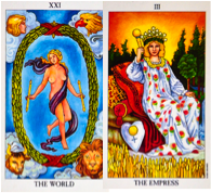 World and Empress tarot birth cards.You have a gift to share – allow it to come forth and ‘birth’ it into this world. By doing so, you will help many, many people around the world who will benefit from your gifts. You are here to help others create and achieve amazing things in their lives.
